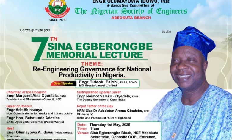 ABEOKUTA- The Nigerian Society of Engineers (NSE), Abeokuta Branch, will on Thursday, May 1, 2025, host the 7th Sina Egberongbe Memorial Lecture in honour of the late Engr. Sina Egberongbe.