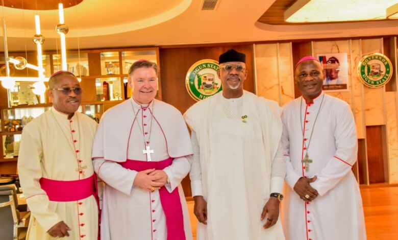 The governor made this known on Friday while receiving the Apostolic Nuncio to Nigeria, Michael Francis Crotty, who paid him a courtesy visit at his office in Oke-Mosan, Abeokuta, alongside the Catholic Bishop of Ijebu-Ode, Francis Obafemi Adesina, the Catholic Bishop of Abeokuta, Peter Odetoyinbo, and other church officials.
