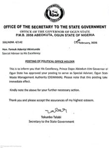 Akintunde’s appointment was confirmed in a letter dated 18th February, 2026 and signed by the Secretary to the Ogun State Government, Tokunbo Talabi.