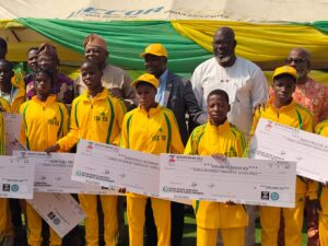 Gov. Abiodun represented by the Sports Commissioner presenting cash reward to NYG medalists