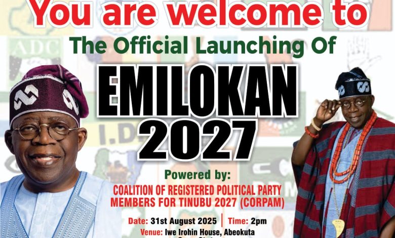 ABEOKUTA – The Coalition of Registered Political Party Members for Tinubu 2027 (CORPAM) will on Sunday 31st August 2025 launch a second term endorsement campaign for President Bola Ahmed Tinubu’s re-election, Tagged “EMILOKAN 2027”.